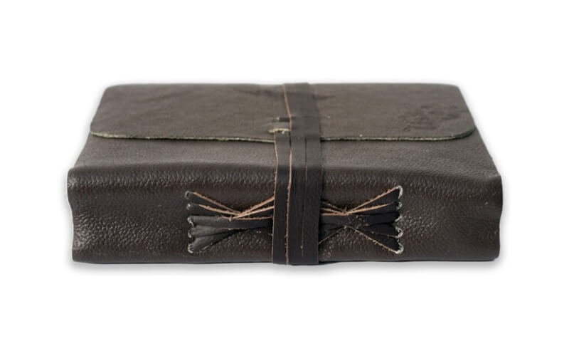 Dit notitieboek is gemaakt van hoogwaardig Indiaans Buffelleer en heeft een prachtige donkerbruine kleur. De leren kaft wordt gesloten met een elegant leren lint, waardoor het boek altijd goed beschermd is.